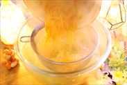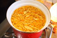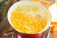 細切りにしておいた皮を手鍋に入れ、たっぷりの水を加えて強火にかけます。全体的にしっかり沸騰したら火をとめてザルにあけゆで汁をきっておきます(ゆでこぼし)