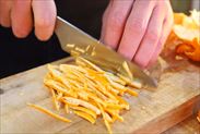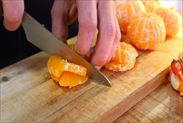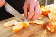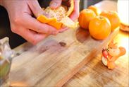 みかんの皮を剥いて、ヘタの部分をカットして取り除き、皮はざっくりカットしてから重ねて約2mm程度に細切りにしておきます(今回は細切りにしたものをさらに半分にカットしました)
