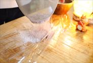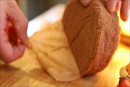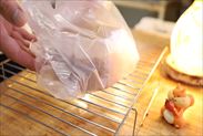焼けたら高さ約3㎝から型を落として生地の熱気を抜き、すぐに型からスポンジケーキを取り出し、そのまま3分冷まします。3分冷ましたら袋に入れたりラップで包んで保湿しながら常温に30分~1時間ほど置いてふんわりしっとりさせます