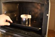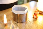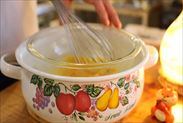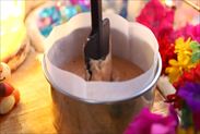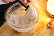 湯煎にあてて混ぜながらお風呂くらいの温度になるまで温めます。温まったら湯煎から取り出します