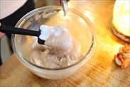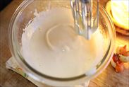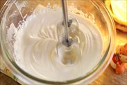 今回はまず最高スピードで約2分半ほど泡立てました(最初の45秒くらいボウルを傾けて、ハンドミキサーを斜めにあて泡を含みやすいようにしました)