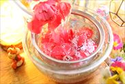 傷んだ部分を取り除いた花びらはすぐに加工していきます傷んだ部分を取り除いた花びらにたっぷりの水を加えて優しく洗い、ザルにあけて水をきります。